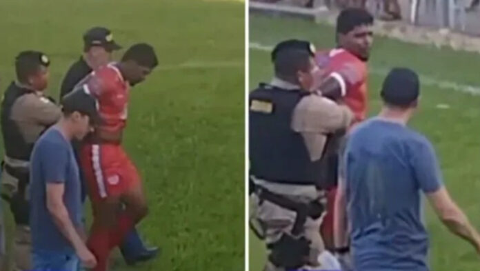 Um jogador foi preso durante uma partida de futebol amador em Mutum, a 380 km de Belo Horizonte. Um vídeo feito no local mostra o homem sendo levado pelos policiais durante o jogo entre Mutum e Durandé, pela Copa do Café. pic.twitter.com/fnhSjAF1KF