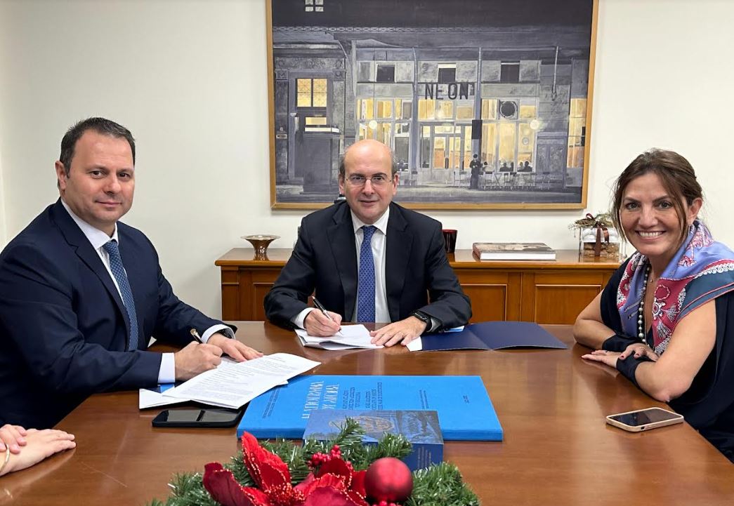Σύμβαση για το έργο «Ολοκλήρωση των διαδικασιών καταγραφής στο Εθνικό Κτηματολόγιο, προστασία και αξιοποίηση της Δημόσιας Περιουσίας αρμοδιότητας της γενικής γραμματείας Δημόσιας Περιουσίας του υπουργείου Εθνικής Οικονομίας και Οικονομικών» υπέγραψαν ο αρμόδιος υπουργός, Κωστής Χατζηδάκης και ο εντεταλμένος σύμβουλος της Μονάδας Συμβάσεων Στρατηγικής Σημασίας του ΤΑΙΠΕΔ Παναγιώτης Σταμπουλίδης, παρουσία της γενικής γραμματέως Δημόσιας Περιουσίας, Νάγιας Κόλλια.