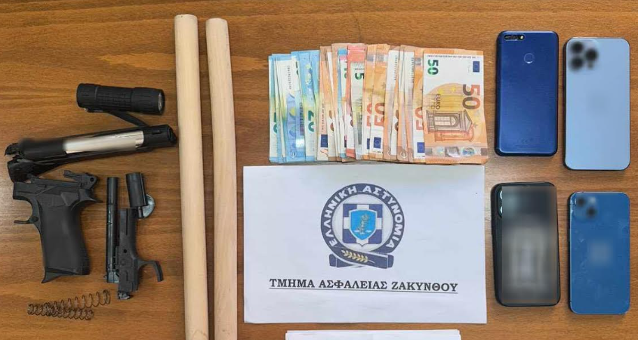 Κατασχέθηκαν πλαστικό πιστόλι, λυμένο στα εξαρτήματά του, -2- ξύλινα ρόπαλα, το συνολικό χρηματικό ποσό των -1.215- ευρώ και -4- κινητά τηλέφωνα
