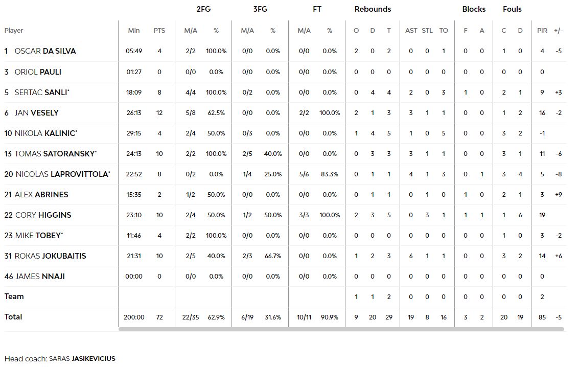 Ο Έβανς με 18 πόντους ήταν ο πρώτος σκόρερ των νικητών ενώ από 15 είχαν Ουλανόβας και Σμιτς. Για τους «μπλαουγκράνα» 12 είχε ο Βέσελι και από 10 οι Χίγκινς, Γιοκουμπάιτις και Σατοράνσκι.