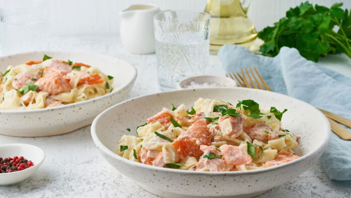 Σουρώστε τα ζυμαρικά, προσθέστε τα στο ταψί με το σολομό και ανακατέψτε. Αλατοπιπερώστε κατά βούληση.